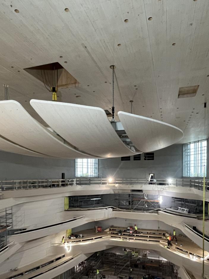 Akustiikkasuunnittelijat seuraavat ja valvovat suunnitelmien toteutumista rakentamisen aikana sekä avustavat työmaata toteuttamaan ääniteknisesti haastavan rakennuksen onnistuneesti. Akustiikkasuunnittelijat ovat käyneet kevään aikana muun muassa testaamassa parvien etupintojen heijastuksia.