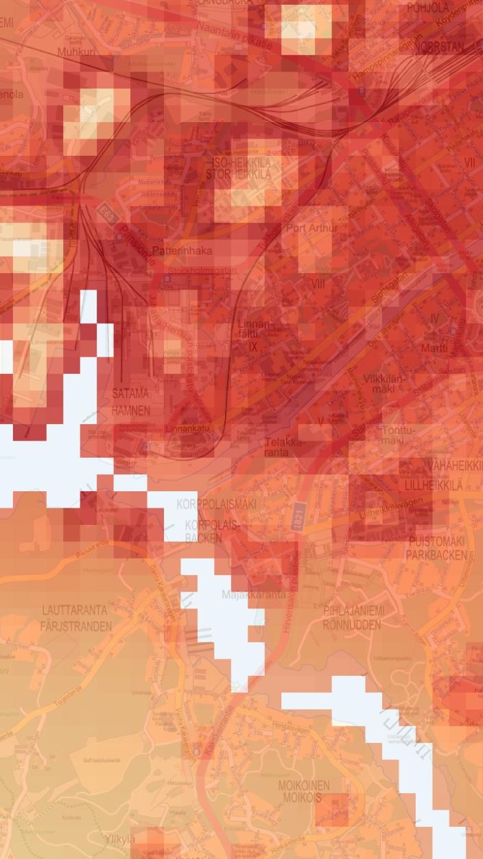 Kartan kuvaamalla hellejaksolla korkeimpia lämpötiloja esiintyi Turun keskustassa ja lähiöissä sekä etelään suuntautuvilla kalliorannoilla. Tietoa lämpötilaeroista voi hyödyntää esimerkiksi korkeiden lämpötilojen aiheuttamien terveysriskien alueellisten erojen arvioinnissa.