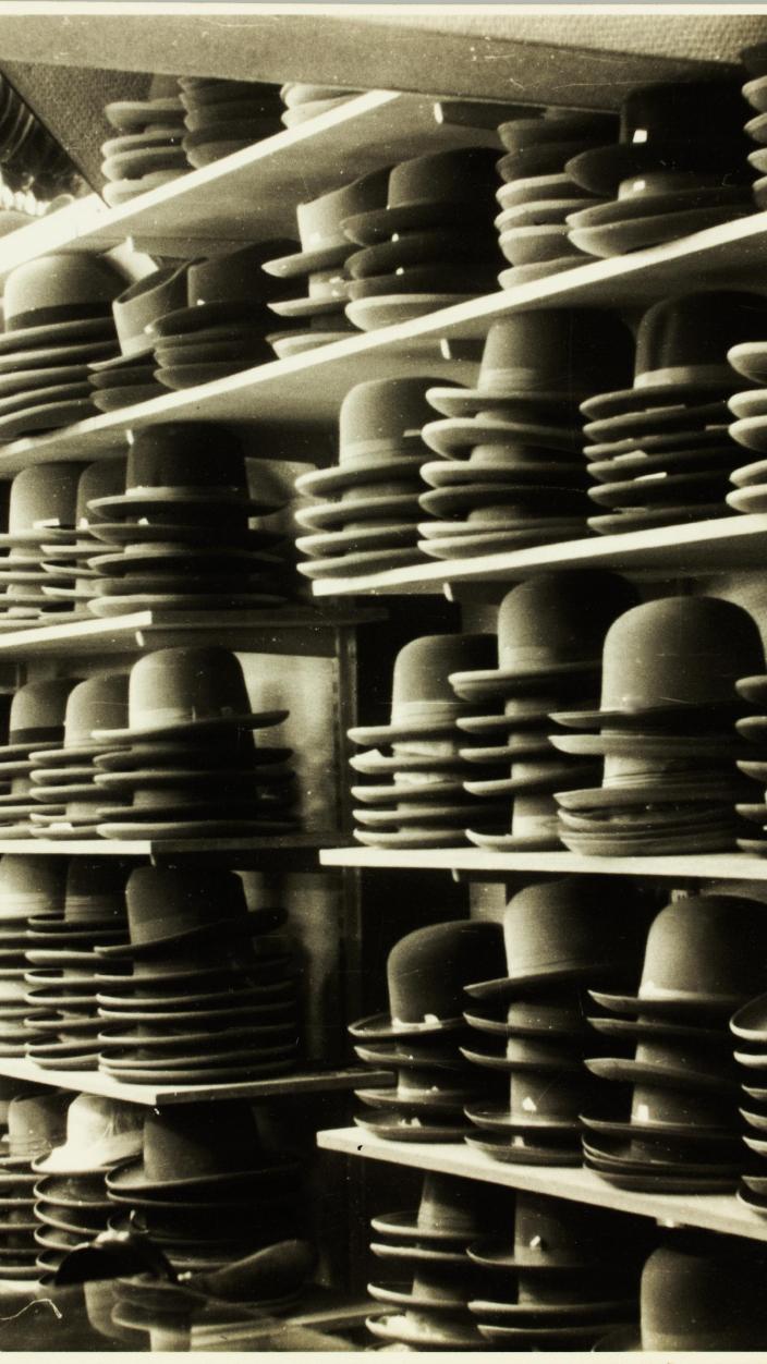Vanha valokuva vaatetusliikkeen sisätiloista, jossa runsaasti miesten hattuja ja hattulaatikoita pinottuina seinähyllyille. (Kuva: Foto Rautavuori / Reprokuva: Eija Karnisto, Turun kaupunginmuseo)