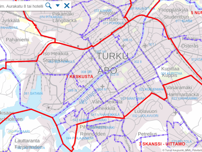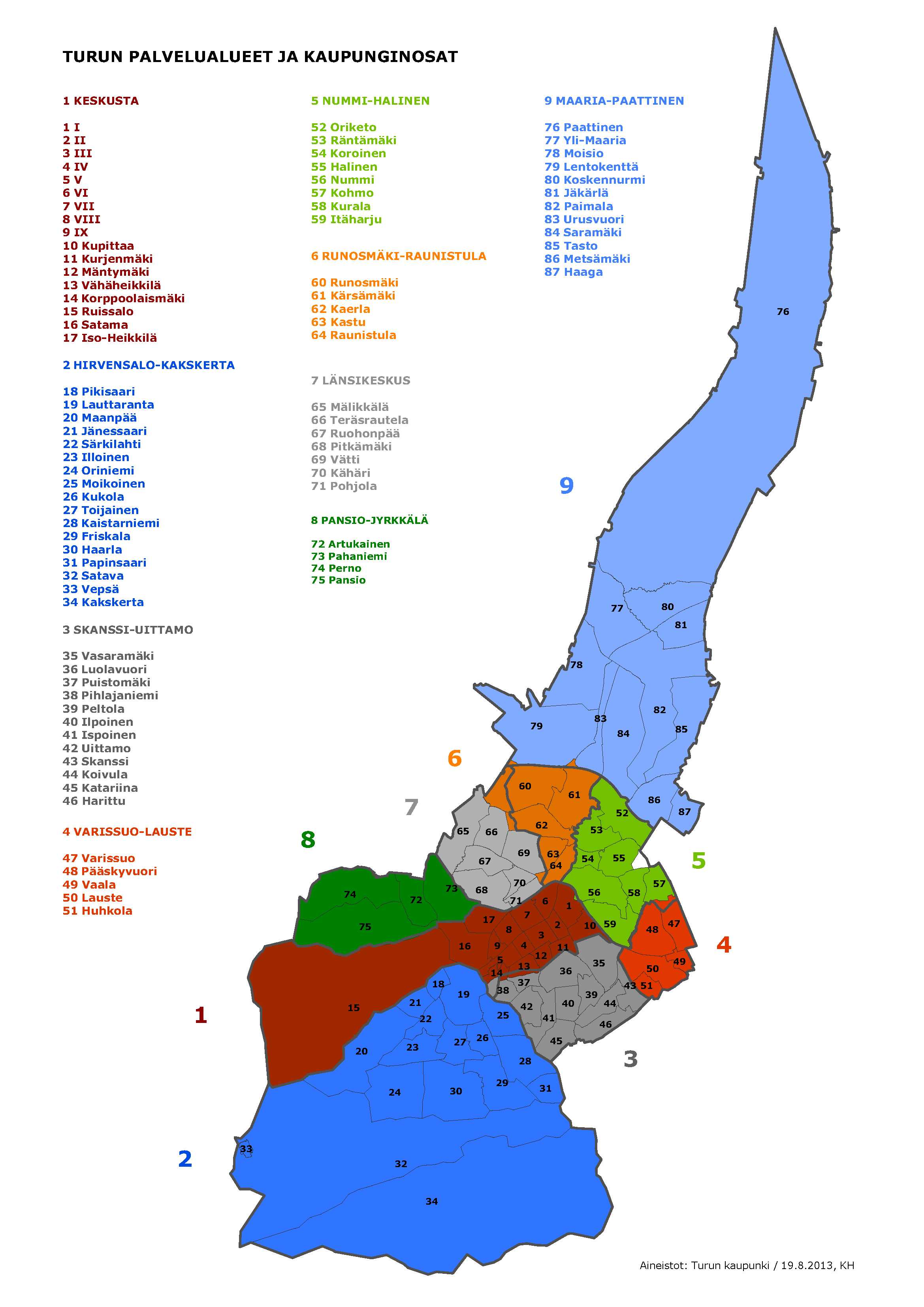 Kaupunginosat I–IX, Kupittaa, Kurjenmäki, Mäntymäki, Vähäheikkilä, Korppolaismäki, Ruissalo, Satama, Iso-Heikkilä -