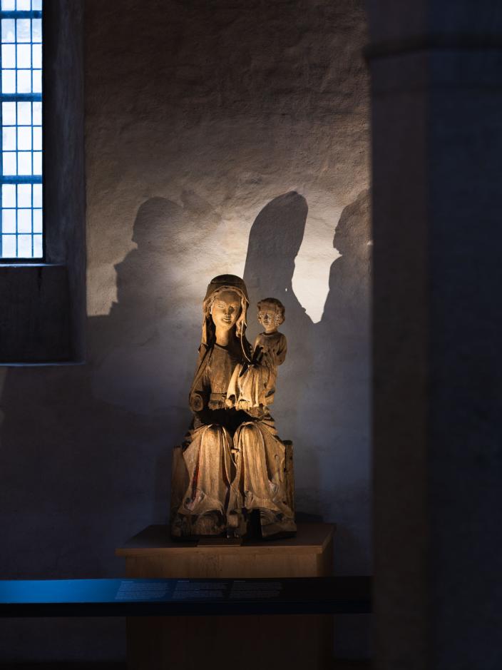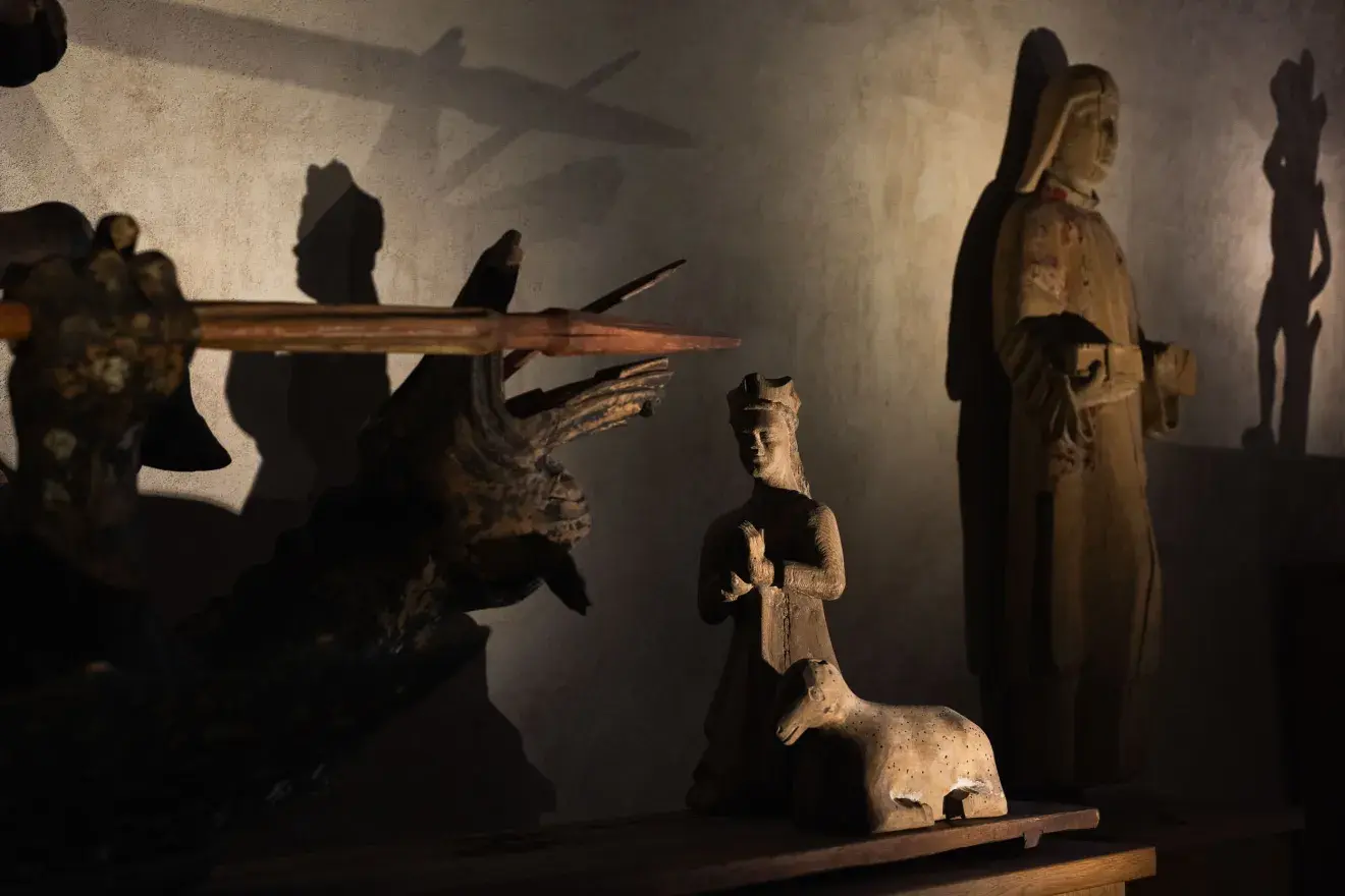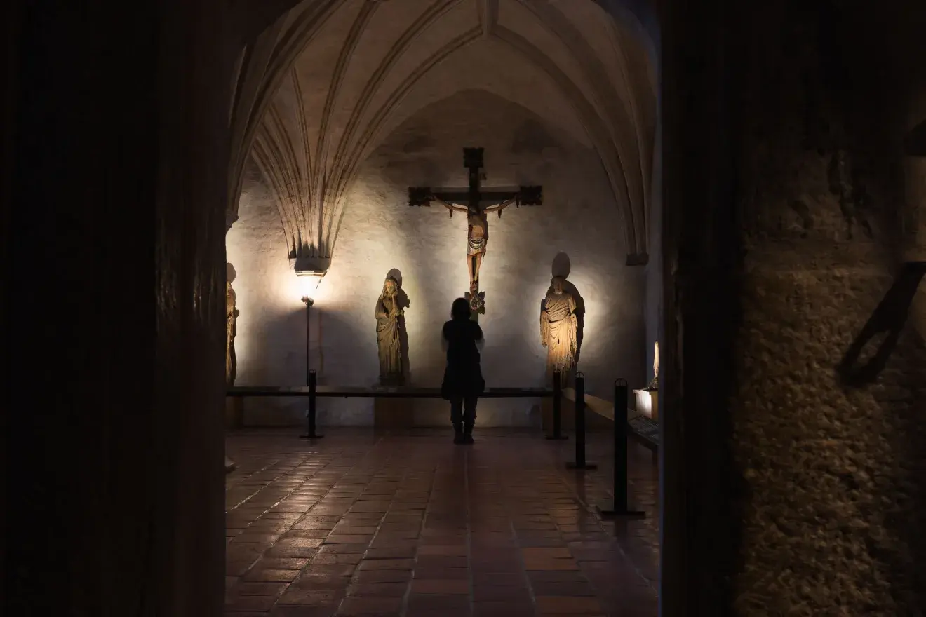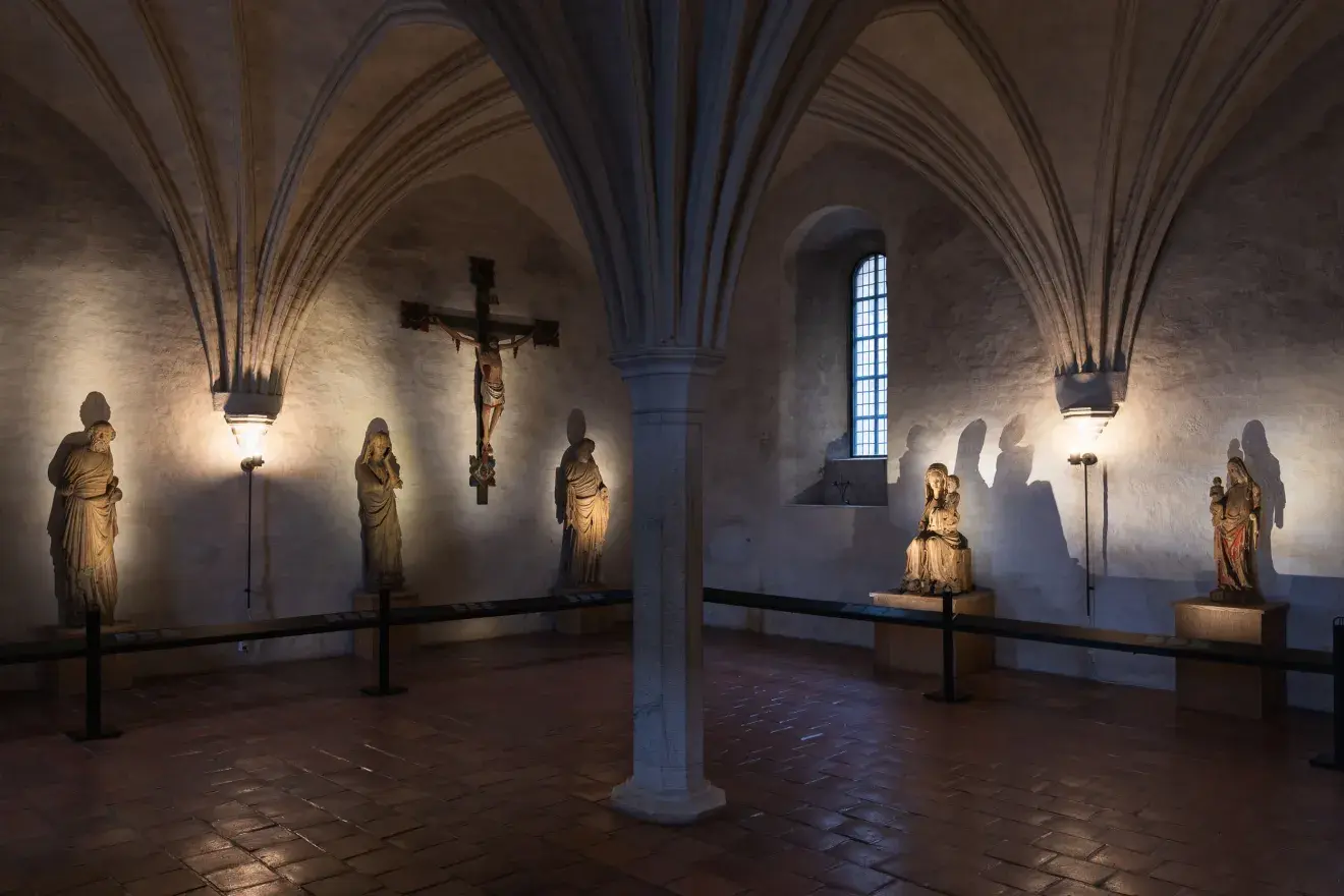 Yleisnäkymä tunnelmallisesti valaistusta Nunnakappelista, jossa keskiaikaisia puuveistoksia esillä., Avaa kuva galleriassa