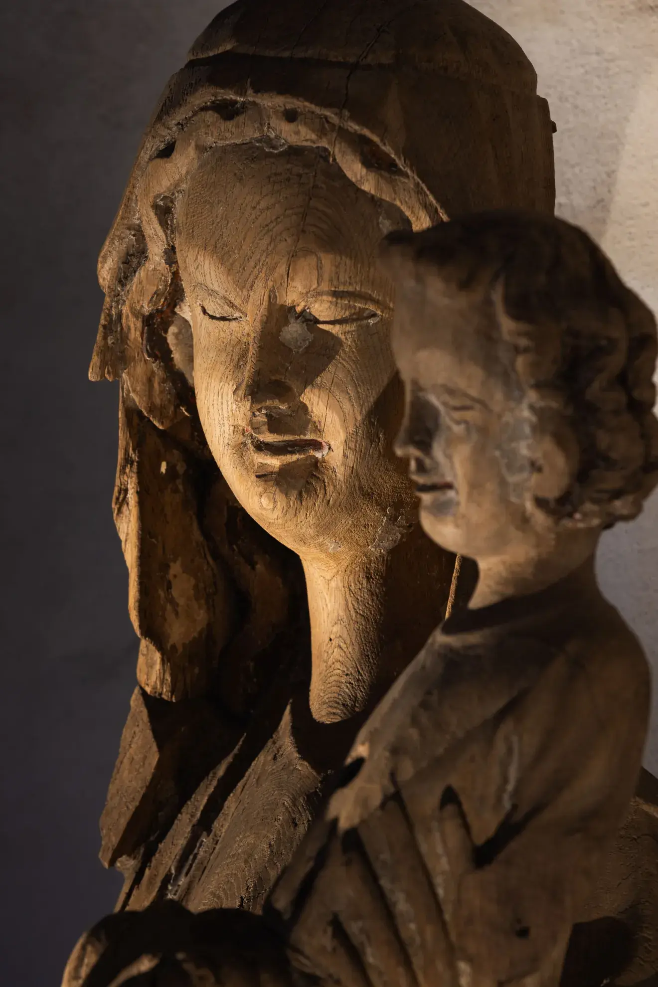 Lähikuva keskiaikaisesta puuveistoksesta, joka kuvaa neitsyt Mariaa ja Jeesus-lasta. Teos on hyvin herkkä ja kaunis., Avaa kuva galleriassa