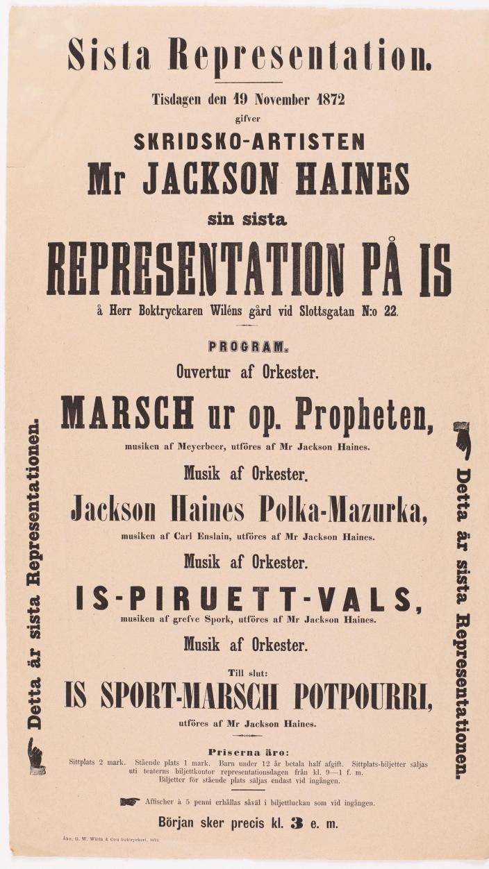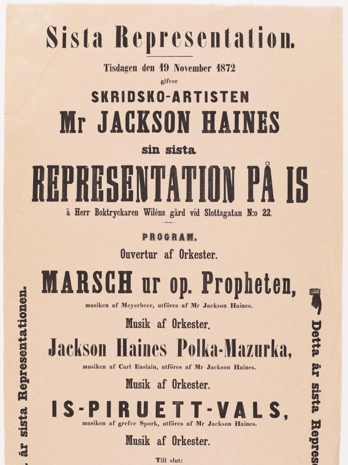 New Yorkista kotoisin oleva tanssija ja taitoluistelun isäksikin tituleerattu Jackson Haines (1838–1875) kiersi Eurooppaa laajasti 1860- ja 1870-luvuilla. Uransa hän oli aloittanut Yhdysvalloissa, mutta päätyi Eurooppaan, kun hän ei saanut maassa arvostusta tanssia ja luistelua yhdisteleville esityksilleen. Aiemmin vuoden 1872 aikana hän oli esiintynyt Turussa myös teatterilavalla, jolloin hän esitti luistelutaitojaan jalassaan kehittelemänsä rullaluistimet.