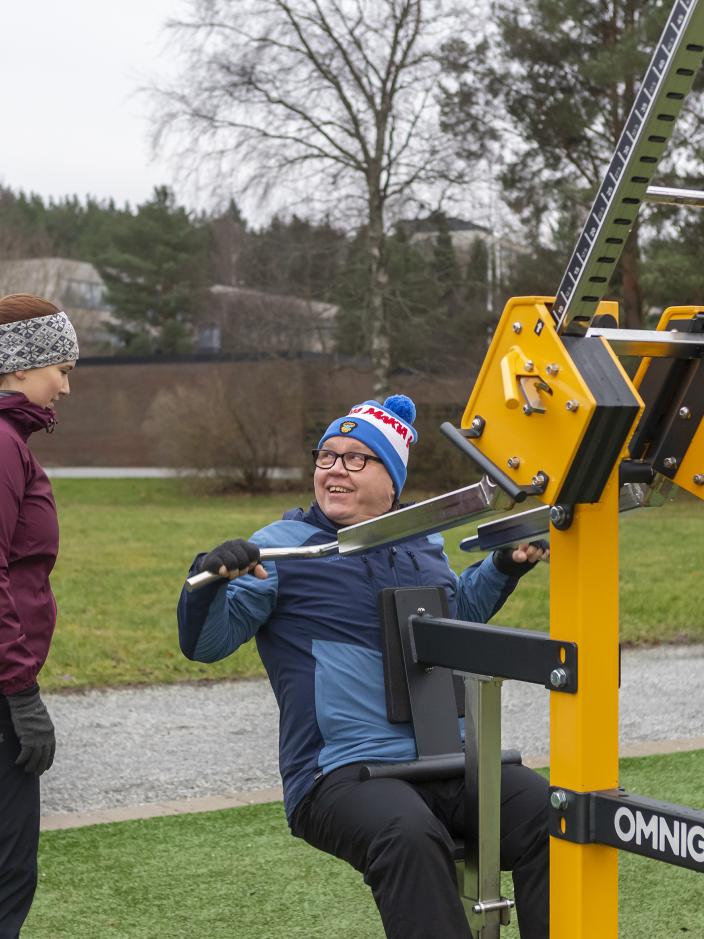 Petri Uggeldahl, 58 år gör bänkpress på utomhusträningsredskapet i Urkolaparken. Vikterna är inte för tunga så mannen ler.