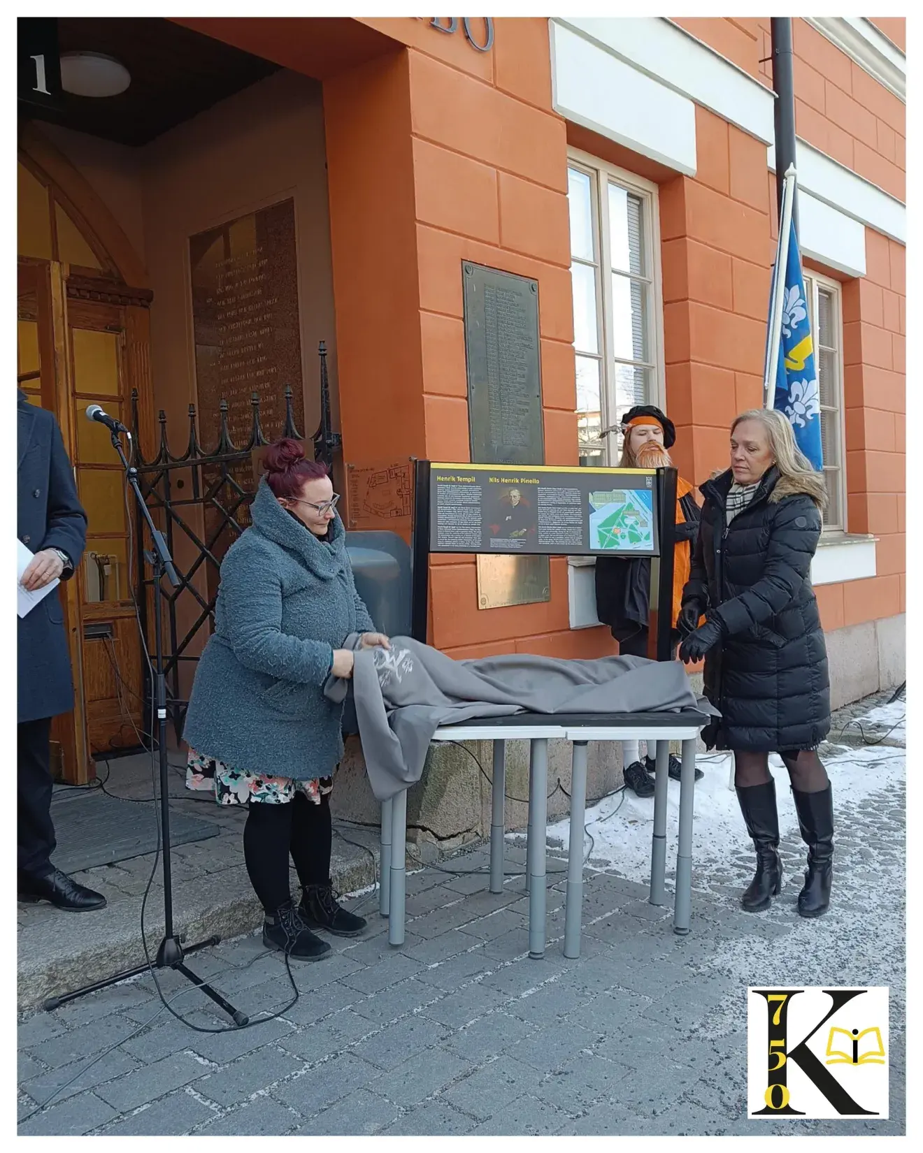 Anna Aalto, ordförande i Katedralskoleföreningen i Åbo, och Marianne Pärnänen, rektor på Katedralskolan, avtäcker Henrik Tempils stig-skylten framför Katedralskolan, Öppna bild i galleriet