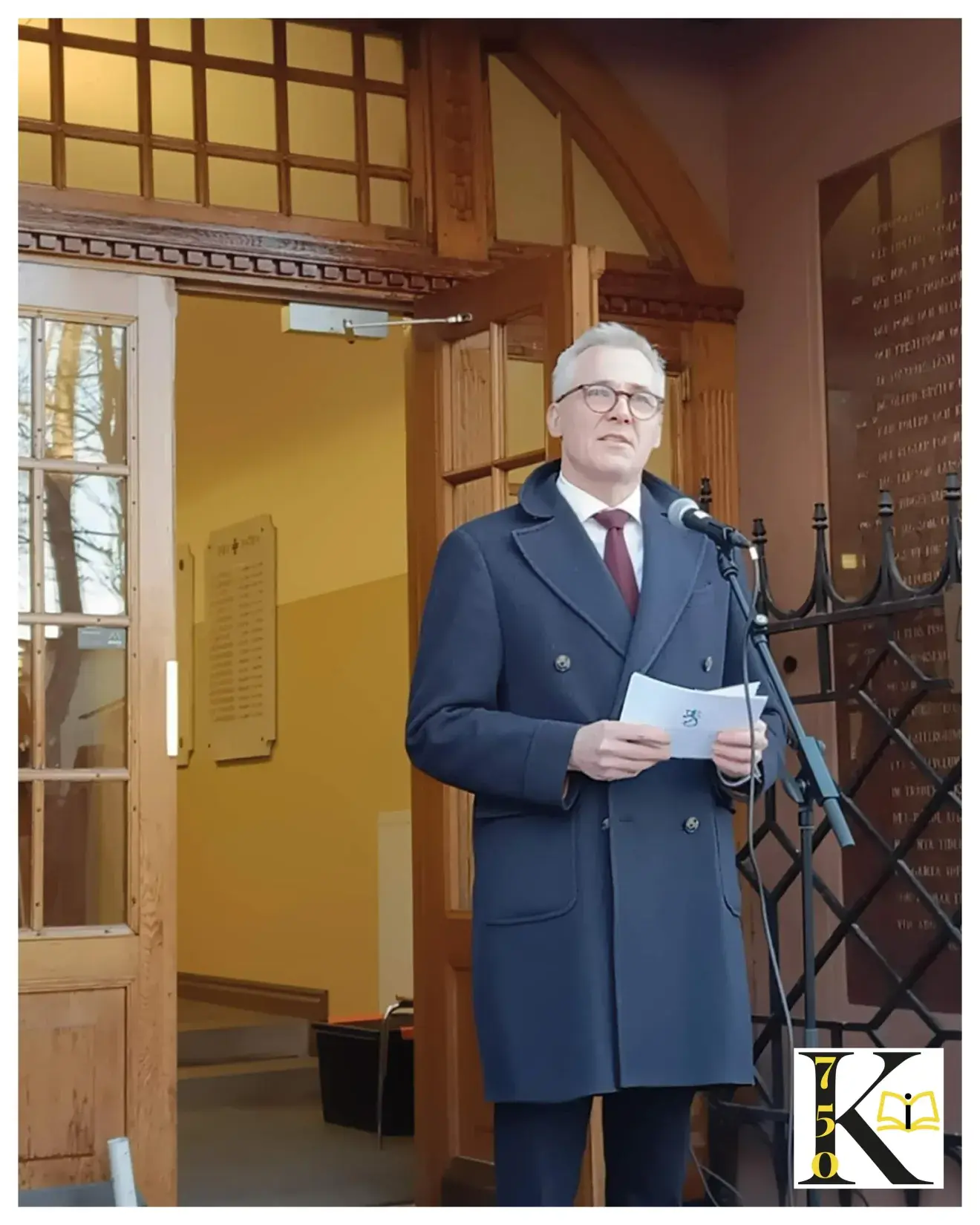 Utbildningsminister Anders Adlercreutc håller tal vid Katedralskolans huvudentré., Öppna bild i galleriet