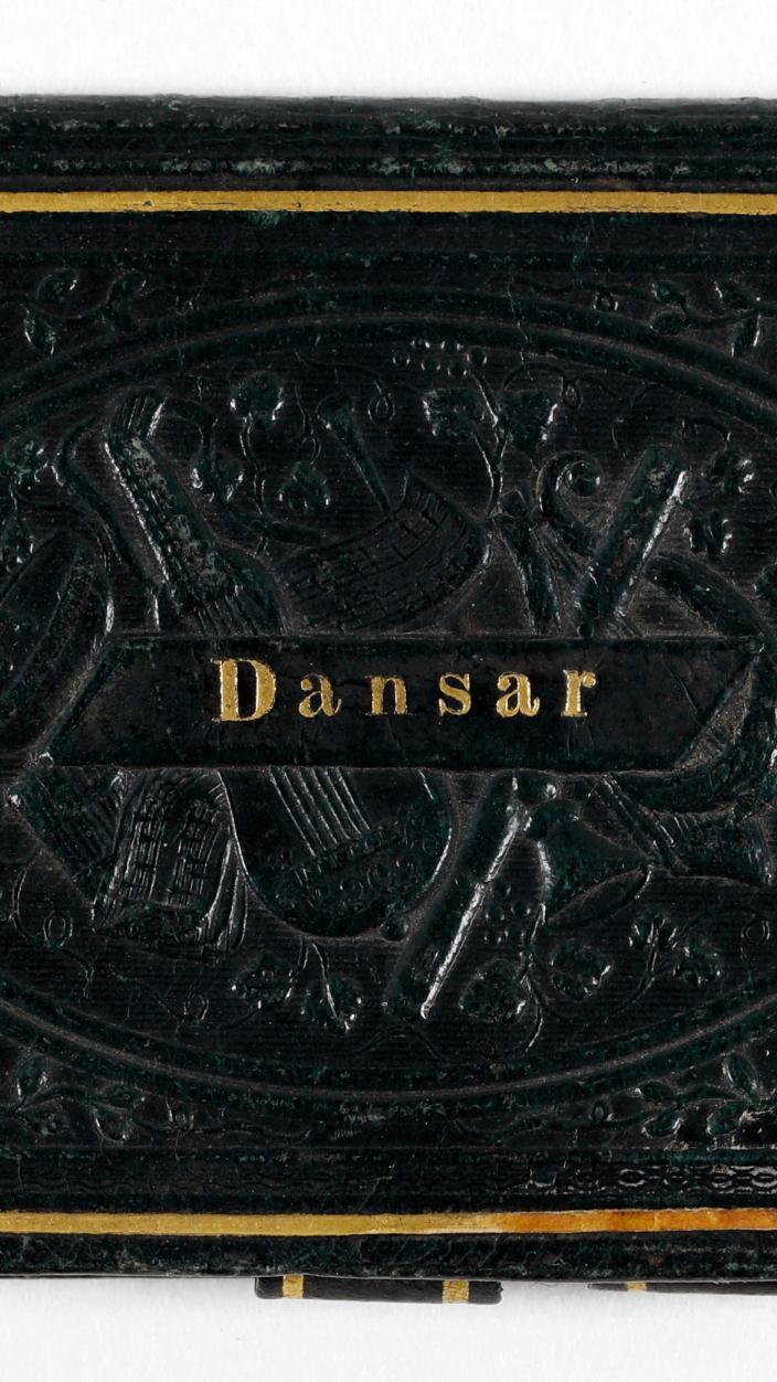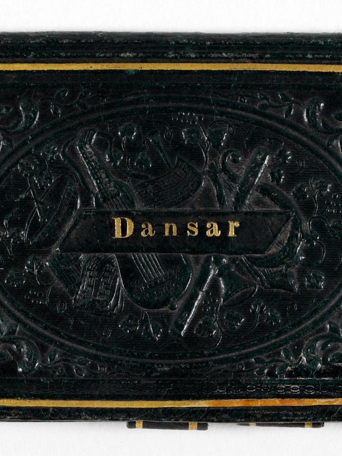 Mustakantinen pieni vihko, jonka kannessa kohopainolla tanssiva pariskunta sekä teksti "Dansar". (Kuva: Anna Saarikko, Turun kaupunginmuseo)