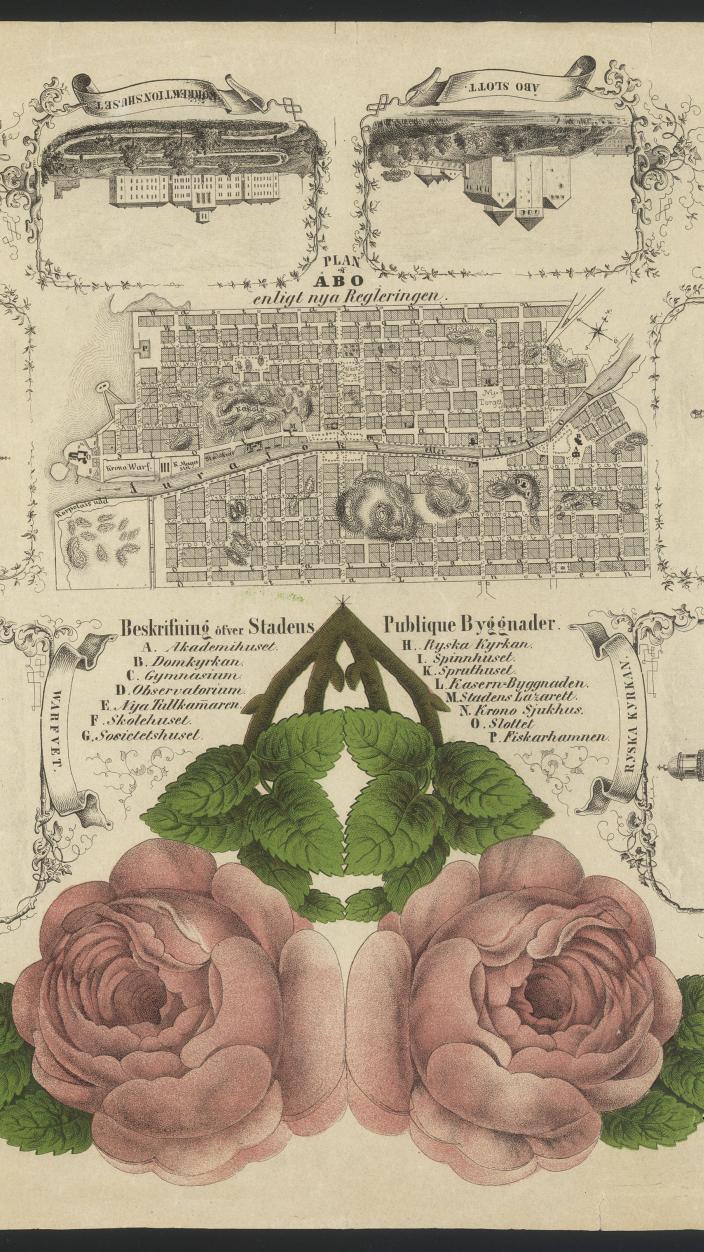 Turun ruusun etupuolella on painotuotteen ainut värilitografinen osio, kolmion muotoon sommitellut kaksi ruusua lehtineen, jotka taitettaessa muodostavat ”ruusun” ulkopuolet. Ruusujen yllä on Turun asemakaava vuodelta 1829, luettelo kaupungin julkisista rakennuksista sekä kuusi pientä köynnöskehysten ympäröimää kaupunkikuvaa selityksineen: Venäläinen kirkko (eli ortodoksinen Pyhän marttyyrikeisarinna Aleksandran kirkko), Observatorio, Turun linna, Ojennuslaitos eli vankila, Tuomiokirkko pohjoispuolelta nähtynä ja Telakka.